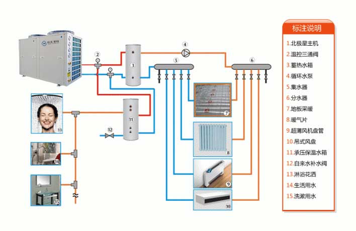 空氣能地暖機用35~50℃(對流暖氣片需85℃),熱量集中在人體的受益高度內(2米以下),比傳統的采暖方式節能75%。